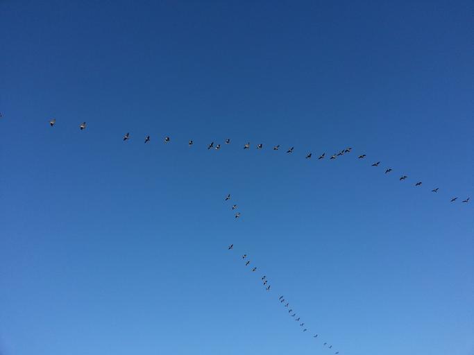 Keywords: migration birds migrating migratory flying flock flight fly geese sky blue formation migrate waterfowl fall