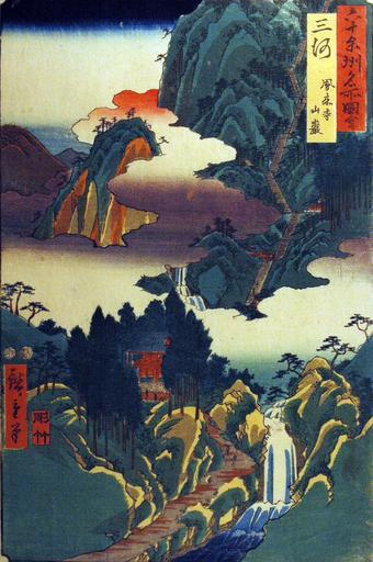 | Keywords: Mikawa Province, Horai Temple Mountains (5765895608).jpg en <b>Accession Number </b> 1957 290 <b>Display Artist </b> Utagawa Hiroshige <b>Display Title </b> Mikawa Province Horai Temple Mountains <b>Translation s </b> Mikawa Horaiji sangan <b>Series Title </b> Famous Views of the Sixty-odd Provinces <b>Suite Name </b> Rokujuyoshu meisho zue <b>Creation Date </b> 1853 <b>Medium </b> Woodblock <b>Height </b> 13 9/16 in <b>Width </b> 9 in <b>Display Dimensions </b> 13 9/16 in x 9 in 34 45 cm x 22 86 cm <b>Publisher </b> Koshimuraya Heisuke <b>Credit Line </b> Bequest of Mrs Cora Timken Burnett <b>Label Copy </b> One of Series Rokuju ye Shin Meisho dzu View of 60 or More Provinces Published by Koshei kei in 1853-1856 Included in this collection are 3 duplicates <b>Collection </b> http //www sdmart org/art/our-collection/asian-art The San Diego Museum of Art 2007-12-19 15 10 46 https //www flickr com/photos/thesandiegomuseumofartcollection/5765895608/ Flickr en thesandiegomuseumofartcollection PD-old-100 Art of Japan in the San Diego Museum of Art |