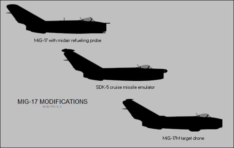 Keywords: Mikoyan-Gurevich MiG-17 variant side-view silhouettes (Probe, SDK-5 emulator, MiG-17M drone).png en Side-view silhouettes of Mikoyan-Gurevich MiG-17 variants http //www vectorsite net/Avmig15_2_08 png greg goebel 2011-01-18 VectorSite images by Greg Goebel are In The Public Domain Greg Goebel MiG-17 drawings Images by Greg Goebel |