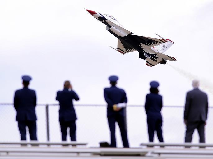 Keywords: military jet air show fighter thunderbirds onlookers watching aviation performance flight climb aerobatic plane airplane flying
