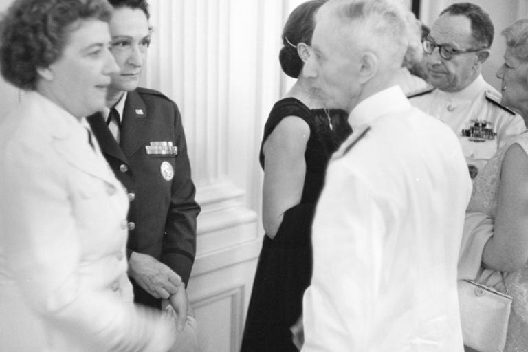 | Keywords: u.s. national archives usnationalarchives jfk presidential library jfkpresidentiallibrary people blackandwhite monochrome indoor black and white Original Caption: Military Reception at the White House We are looking for your help in identifying unknown people in our White House Photographs collection. If you have any information about this photograph, please post a comment, including any relevant sources, for the catalogers at the John F. Kennedy Presidential Library. Thank you! Local Identifier: JFKWHP-KN-21815 Created By: President (1961-1963 : Kennedy). Office of the Naval Aide to the President. (1961 - 1963) From: Collection JFK-WHP: White House Photographs, 12/19/1960 - 03/11/1964 Contact: John F. Kennedy Library (LP-JFK), Columbia Point Boston, MA 02125-3398 Phone: 617-514-1600 Fax: 617-514-1652 Email: kennedy.library@nara.gov Production Dates: 15 May 1962 Photo Credit: Robert Knudsen. White House Photographs. John F. Kennedy Presidential Library and Museum, Boston Scope and Content Note: In this photograph, guests attend a military reception at the White House, Washington, D.C. Persistent URL: JFK Library URL: www.jfklibrary.org/Asset-Viewer/Archives/JFKWHP-KN-21815.... Access Restrictions: Unrestricted Use Restrictions: Unrestricted Original Caption: Military Reception at the White House We are looking for your help in identifying unknown people in our White House Photographs collection. If you have any information about this photograph, please post a comment, including any relevant sources, for the catalogers at the John F. Kennedy Presidential Library. Thank you! Local Identifier: JFKWHP-KN-21815 Created By: President (1961-1963 : Kennedy). Office of the Naval Aide to the President. (1961 - 1963) From: Collection JFK-WHP: White House Photographs, 12/19/1960 - 03/11/1964 Contact: John F. Kennedy Library (LP-JFK), Columbia Point Boston, MA 02125-3398 Phone: 617-514-1600 Fax: 617-514-1652 Email: kennedy.library@nara.gov Production Dates: 15 May 1962 Photo Credit: Robert Knudsen. White House Photographs. John F. Kennedy Presidential Library and Museum, Boston Scope and Content Note: In this photograph, guests attend a military reception at the White House, Washington, D.C. Persistent URL: JFK Library URL: www.jfklibrary.org/Asset-Viewer/Archives/JFKWHP-KN-21815.... Access Restrictions: Unrestricted Use Restrictions: Unrestricted |