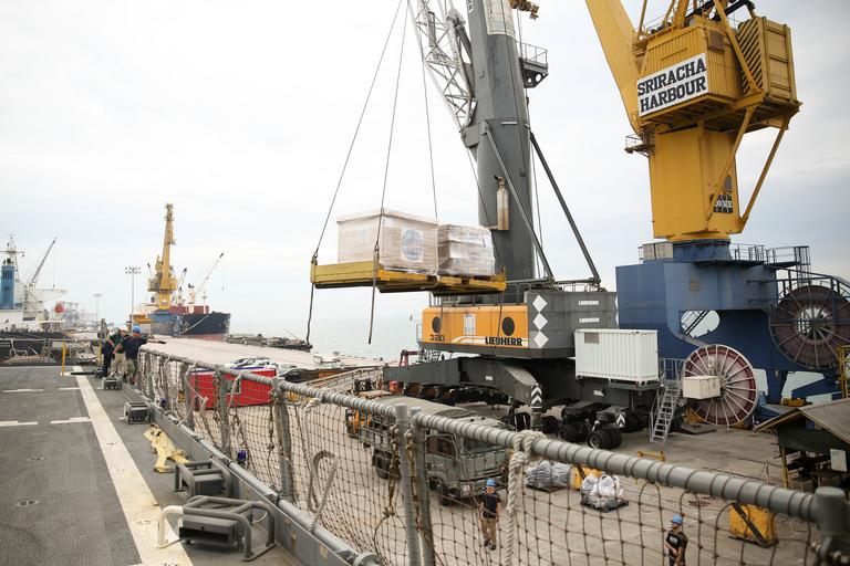 | Keywords: Military Sealift Command delivers Handclasp, joy in time for holidays 161214-N-IX266-002.jpg en 161214-N-IX266-002 SRIRACHA Thailand ”Civilian mariners from USNS Washington Chambers T-AKE 11 unload Project Handclasp humanitarian items here in preparation for a community relations event at local schools here Dec 14 Handclasp pallets included complete sporting equipment toys English textbooks school materials and hygiene and medical-relate items U S Navy photo by Grady T Fontana/Released Unit Military Sealift Command Far East DVIDS Tags Project Handclasp; Pacific; MSC; Mariners; Navy; Comrel; Thailand; Outreach; chaplain; C7F; Thai; USNS Washington Chambers T-AKE- 11 ; naval ship; CIVMAR; Military Sealift Command Far East; MSCFE; CTF-73 2016-12-14 Grady Fontana https //www dvidshub net/image/3064135/military-sealift-command-delivers-handclasp-joy-time-holidays 161214-N-IX266-002 2016-12-16 09 06 SRIRACHA TH PD-USGov-Military-Navy USNS Washington Chambers T-AKE-11 Images from DoD uploaded by Fæ |