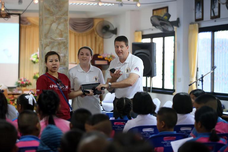 | Keywords: Military Sealift Command Far East, USNS Walter S. Diehl delivers books, holiday cheer to Thai children 151221-N-IX266-009.jpg en 151221-N-IX266-009 CHANTHABURI Thailand Dec 21 - Monnpapat Tudtanapun a volunteer from the Marriot Hotel in Pattaya Rachel Kitzman a member of the Singapore Keystone Club and Lt Cmdr Glen D Kitzman chaplain Military Sealift Command Far East play holiday music to the students of Pliu elementary school here during a recent community outreach event The volunteers used innovative music strategies and creative methods to teach English to more than 120 students MSCFE and the Singapore Area Coordinator Community in Singapore also donated more than 1 200 English books to the Pong Nam Ron Pliu and Ban Trok Nong elementary schools here U S Navy photo by Grady T Fontana/Released <br>Unit Military Sealift Command Far East 2015-12-21 Grady Fontana https //www dvidshub net/image/2341565/military-sealift-command-far-east-usns-walter-s-diehl-delivers-books-holiday-cheer-thai-children 151221-N-IX266-009 2015-12-22 06 15 CHANTHABURI TH PD-USGov-Military-Navy Pattaya Images from DoD uploaded by Fæ |