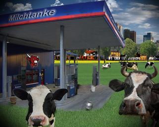 Keywords: milk petrol stations cows humor funny summer dairy farming dairy farmers composing cocoa cow city trees curious horns blue red