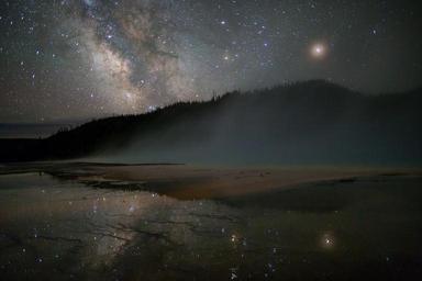 Keywords: milky way stars sky grand prismatic spring hot water reflection night dark cosmos thermal nature volcanic colorful outdoors geothermal minerals boiling pool mist yellowstone national park wyoming usa steam trees silhouettes