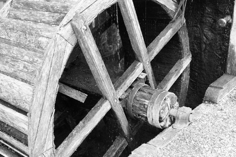 Keywords: mill mill wheel old worn black and white water mill