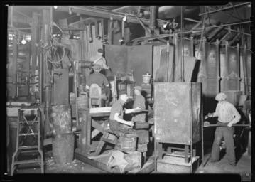Keywords: Millville, New Jersey - Glass bottles. Whitall Tatum green glass shop - NARA - 518653.tif Scope and content Millville New Jersey - Glass bottles Whitall Tatum green glass shop The worker at the extreme left of the picture is a blower taking glass from the oven To his right is a second blower rolling and blowing the glass on a sheet of iron before he puts it in a mould for final blowing Under him is sitting the shaping mould boy The man in profile toward the shaping mould boy is the carrying-up boy who takes the bottles from the mould to the gaffer who is seated slightly to his left in this picture The carrying-up boy on the right is taking the bottles to be annealed General notes 518653 Local identifier 69-RP-424 Federal Works Agency Work Projects Administration National Research Project ca 1941 - ca 1942 NARA-Author Hine Lewis Wickes 1874-1940 Photographer 1122914 <br /> Millville Cumberland New Jersey United States North and Central America inhabited place 3354813 39 4 -75 033 <br /> Still Picture Records Section Special Media Archives Services Division NWCS-S National Archives at College Park 8601 Adelphi Road College Park MD 20740-6001 1937-03-26 Record group Record Group 69 Records of the Work Projects Administration 1922 - 1944 Record group ARC 398 Lewis Hine Photographs for the National Research Project compiled 1936 - 1937 Series ARC 518291 File unit File unit ARC Variant control numbers NAIL Control Number NWDNS-69-RP-424 yes Other versions <gallery> File Millville _New_Jersey_-_Glass_bottles _Whitall_Tatum_green_glass_shop_-_NARA_-_518653 tif tif File Millville _New_Jersey_-_Glass_bottles _Whitall_Tatum_green_glass_shop_-_NARA_-_518653 jpg jpg </gallery> NARA-cooperation PD-USGov Millville New Jersey glassworking industry NARA TIF images with categorized JPGs |