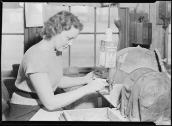 Keywords: Millville, New Jersey - Glass bottles. A skilled worker at T.C. Wheaton grinding glass stoppers for glass bottles. An... - NARA - 518631.jpg Scope and content General notes 518631 Local identifier 69-RP-404 Federal Works Agency Work Projects Administration National Research Project ca 1941 - ca 1942 NARA-Author Hine Lewis Wickes 1874-1940 Photographer 1122914 <br /> Millville Cumberland New Jersey United States North and Central America inhabited place 3354813 39 4 -75 033 <br /> Still Picture Records Section Special Media Archives Services Division NWCS-S National Archives at College Park 8601 Adelphi Road College Park MD 20740-6001 1936 - 1937 Record group Record Group 69 Records of the Work Projects Administration 1922 - 1944 Record group ARC 398 Lewis Hine Photographs for the National Research Project compiled 1936 - 1937 Series ARC 518291 File unit File unit ARC Variant control numbers NAIL Control Number NWDNS-69-RP-404 Other versions <gallery> File Millville _New_Jersey_-_Glass_bottles _A_skilled_worker_at_T C _Wheaton_grinding_glass_stoppers_for_glass_bottles _An _-_NARA_-_518631 tif tif File Millville _New_Jersey_-_Glass_bottles _A_skilled_worker_at_T C _Wheaton_grinding_glass_stoppers_for_glass_bottles _An _-_NARA_-_518631 jpg jpg </gallery> NARA-cooperation PD-USGov Millville New Jersey glassworking industry Black and white photographs Black and white photographs of women Women facing right Glass bottles Polishing wheels Women at work in the United States |