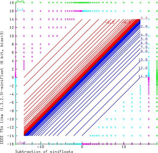 | Keywords: MinifloatSubtraction 1 3 2 3 72.png  Difference of two minifloats with 1 sign bit s 3 exponent bit e 2 mantissa bit m and a bias of 3 analogues to IEEE-754-like floating point values The different classes of IEEE 754 floating point values NaN infinite normal subnormal and zero are highlighted with different colours and marked with symbols NaN has the highest value and infinite has its own numerical value 2 17 Positive values are in blue and cyan negative values are in red and magenta; NaN is represented in green Please note this picture misrepresents subtraction where one of the values is plus or minus infinity own 2005-10-27 brf no Copyright because of own work Image MinifloatSubtraction_1_3_2_3_300 png GFDL Cc-by-sa-3 0-migrated Cc-by-sa-2 5 2 0 1 0 Minifloats |