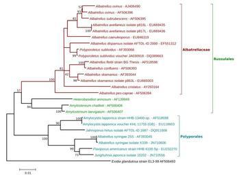 | Keywords: Minimum Evolution-Tree Allbatrellaceae 25S-RNA.svg Evolutionary relationships of Albatrellaceae<br/> Figure Evolutionary relationships of taxa The evolutionary history was inferred using the Minimum Evolution method on the partial 25S rRNA gene The optimal tree with the sum of branch length 0 41327526 is shown The percentage of replicate trees in which the associated taxa clustered together in the bootstrap test 1000 replicates are shown next to the branches The tree is drawn to scale with branch lengths in the same units as those of the evolutionary distances used to infer the phylogenetic tree The evolutionary distances were computed using the Maximum Composite Likelihood method and are in the units of the number of base substitutions per site The ME tree was searched using the Close-Neighbor-Interchange CNI algorithm at a search level of 1 The Neighbor-joining algorithm was used to generate the initial tree The analysis involved 26 nucleotide sequences All positions with less than 95 site coverage were eliminated That is fewer than 5 alignment gaps missing data and ambiguous bases were allowed at any position There were a total of 863 positions in the final dataset Evolutionary analyses were conducted in MEGA5 Evolutionary analyses were conducted in MEGA5 Exidia glandulosa strain EL3-99 AF506493 was used as outgroup All sequences were obtained from the Genbank and were aligned by the CustalW algorithm with standard settings <br/> List of the GenBank Sequences http //www ncbi nlm nih gov/nuccore/AF393045 Albatrellus syringae 25S AF393045 http //www ncbi nlm nih gov/nuccore/EU669435 Albatrellus_avellaneus_isolate_p816L - EU669436 http //www ncbi nlm nih gov/nuccore/EU669436 Albatrellus_avellaneus_isolate_p817L - EU669436 http //www ncbi nlm nih gov/nuccore/EU846319 Albatrellus_caeruleoporus - EU846319 http //www ncbi nlm nih gov/nuccore/AF506393 Albatrellus_confluens - AF506393 http //www ncbi nlm nih gov/nuccore/AY293164 Albatrellus_cristatus - AY293164 http //www ncbi nlm nih gov/nuccore/EF551312 Albatrellus_dispansus_isolate_AFTOL-ID_2000 - EF551312 http //www ncbi nlm nih gov/nuccore/AF518596 Albatrellus_flettii_strain_BG_Thesis - AF518596 http //www ncbi nlm nih gov/nuccore/AF506396 Albatrellus_ovinus - AF506396 http //www ncbi nlm nih gov/nuccore/AJ406490 Albatrellus_ovinus - AJ406490 http //www ncbi nlm nih gov/nuccore/AF506394 Albatrellus_pes-caprae - AF506394 http //www ncbi nlm nih gov/nuccore/AF393044 Albatrellus_skamanius - AF393044 http //www ncbi nlm nih gov/nuccore/EU669303 Albatrellus_skamanius_isolate_p863L - EU669303 http //www ncbi nlm nih gov/nuccore/AF506395 Albatrellus_subrubescens - AF506395 http //www ncbi nlm nih gov/nuccore/JN710606 Albatrellus_syringae_isolate_X339 - JN710606 http //www ncbi nlm nih gov/nuccore/AF518598 Amylocystis lapponica strain HHB-13400-sp - AF518598 http //www ncbi nlm nih gov/nuccore/EU118603 Amylocystis lapponica voucher KHL 11755 GB - EU118603 http //www ncbi nlm nih gov/nuccore/AF506406 Amylostereum chailletii - AF506406 http //www ncbi nlm nih gov/nuccore/AF506407 Amylostereum laevigatum - AF506407 http //www ncbi nlm nih gov/nuccore/AF506493 Exidia glandulosa strain EL3-99 - AF506493 http //www ncbi nlm nih gov/nuccore/EU232270 Flaviporus americanus strain HHB 4100-Sp - EU232270 http //www ncbi nlm nih gov/nuccore/AF139949 Heterobasidion annosum AF139949 http //www ncbi nlm nih gov/nuccore/DQ911606 Jahnoporus_hirtus_isolate_AFTOL-ID_1687 - DQ911606 http //www ncbi nlm nih gov/nuccore/JN710556 Junghuhnia japonica isolate 10202 - JN710556 http //www ncbi nlm nih gov/nuccore/AF393066 Polyporoletus_sublividus - AF393066 http //www ncbi nlm nih gov/nuccore/DQ389663 Polyporoletus_sublividus_voucher_JA030918 - DQ389663 own 2014-06-13 User Thkgk Cc-zero Albatrellaceae Cc-zero |