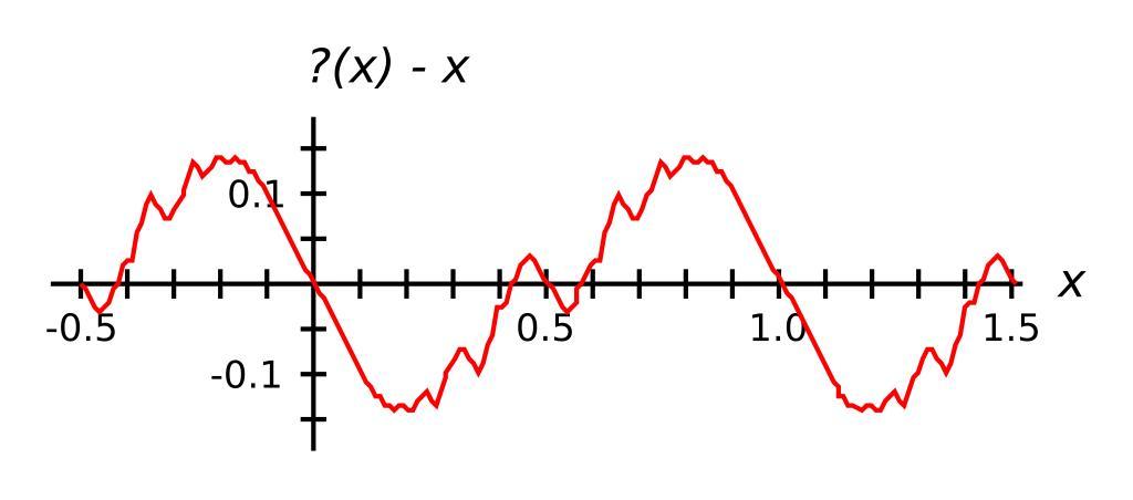 | Keywords: Minkowski question-mark plot qm(x)-x.svg Minkowski's question mark minus the identity <math> x - x</math> Funció signe d'interrogació menys la identitat <math> x - x</math> Función de interrogación de Minkowski menos la identidad <math> x - x</math> Minkowskiren galdera funtzioa ken identitatea <math> x - x</math> 2014-01-05 20 19 06 own Xoneca Minkowski'sQuestionMarkLessTheIdentity png Plot data x x - x -0 50 0 0 -0 49 -0 00999997764826 -0 48 -0 0198779296875 -0 47 -0 0279858398438 -0 46 -0 0312109375 -0 45 -0 0265625 -0 44 -0 0209375 -0 43 -0 00750381469727 -0 42 0 00203125 -0 41 0 0242578125 -0 40 0 025 -0 39 0 0276953125 -0 38 0 05578125 -0 37 0 0662890625 -0 36 0 0865625 -0 35 0 09609375 -0 34 0 0899961853027 -0 33 0 0800000000291 -0 32 0 0709765625 -0 31 0 07220703125 -0 30 0 08125 -0 29 0 09908203125 -0 28 0 1003125 -0 27 0 1186328125 -0 26 0 1320703125 -0 25 0 125 -0 24 0 116953125 -0 23 0 120747070313 -0 22 0 1272265625 -0 21 0 139931640625 -0 20 0 1375 -0 19 0 131650390625 -0 18 0 1341015625 -0 17 0 138566894531 -0 16 0 130703125 -0 15 0 13046875 -0 14 0 124497070313 -0 13 0 120356445313 -0 12 0 1131640625 -0 11 0 106095657349 -0 10 0 098046875 -0 09 0 0890253448486 -0 08 0 0796337890625 -0 07 0 0698893737793 -0 06 0 0599809265137 -0 05 0 0499980926514 -0 04 0 0399999403954 -0 03 0 0299999997963 -0 02 0 02 -0 01 0 01 0 00 0 0 0 01 -0 01 0 02 -0 02 0 03 -0 0299999997963 0 04 -0 0399999403954 0 05 -0 0499980926514 0 06 -0 0599809265137 0 07 -0 0698893737793 0 08 -0 0796337890625 0 09 -0 0890253448486 0 10 -0 098046875 0 11 -0 106095657349 0 12 -0 1131640625 0 13 -0 120356445313 0 14 -0 124497070313 0 15 -0 13046875 0 16 -0 130703125 0 17 -0 138566894531 0 18 -0 1341015625 0 19 -0 131650390625 0 20 -0 1375 0 21 -0 139931640625 0 22 -0 1272265625 0 23 -0 120747070313 0 24 -0 116953125 0 25 -0 125 0 26 -0 1320703125 0 27 -0 1186328125 0 28 -0 1003125 0 29 -0 09908203125 0 30 -0 08125 0 31 -0 07220703125 0 32 -0 0709765625 0 33 -0 0800000000291 0 34 -0 0899961853027 0 35 -0 09609375 0 36 -0 0865625 0 37 -0 0662890625 0 38 -0 05578125 0 39 -0 0276953125 0 40 -0 025 0 41 -0 0242578125 0 42 -0 00203125 0 43 0 00750381469727 0 44 0 0209375 0 45 0 0265625 0 46 0 0312109375 0 47 0 0279858398438 0 48 0 0198779296875 0 49 0 00999997764826 0 50 0 0 0 51 -0 00999997764826 0 52 -0 0198779296875 0 53 -0 0279858398438 0 54 -0 0312109375 0 55 -0 0265625 0 56 -0 0209375 0 57 -0 00750381469727 0 58 0 00203125 0 59 0 0242578125 0 60 0 025 0 61 0 0276953125 0 62 0 05578125 0 63 0 0662890625 0 64 0 0865625 0 65 0 09609375 0 66 0 0899961853027 0 67 0 0800000000291 0 68 0 0709765625 0 69 0 07220703125 0 70 0 08125 0 71 0 09908203125 0 72 0 1003125 0 73 0 1186328125 0 74 0 1320703125 0 75 0 125 0 76 0 116953125 0 77 0 120747070312 0 78 0 1272265625 0 79 0 139931640625 0 80 0 1375 0 81 0 131650390625 0 82 0 1341015625 0 83 0 138566894531 0 84 0 130703125 0 85 0 13046875 0 86 0 124497070313 0 87 0 120356445313 0 88 0 1131640625 0 89 0 106095657349 0 90 0 098046875 0 91 0 0890253448486 0 92 0 0796337890625 0 93 0 0698893737793 0 94 0 0599809265137 0 95 0 0499980926514 0 96 0 0399999403954 0 97 0 0299999997963 0 98 0 02 0 99 0 01 1 00 0 0 1 01 -0 01 1 02 -0 02 1 03 -0 0299999997963 1 04 -0 0399999403954 1 05 -0 0499980926514 1 06 -0 0599809265137 1 07 -0 0698893737793 1 08 -0 0796337890625 1 09 -0 0890253448486 1 10 -0 098046875 1 11 -0 106095657349 1 12 -0 1131640625 1 13 -0 120356445312 1 14 -0 124497070312 1 15 -0 13046875 1 16 -0 130703125 1 17 -0 138566894531 1 18 -0 1341015625 1 19 -0 131650390625 1 20 -0 1375 1 21 -0 139931640625 1 22 -0 1272265625 1 23 -0 120747070312 1 24 -0 116953125 1 25 -0 125 1 26 -0 1320703125 1 27 -0 1186328125 1 28 -0 1003125 1 29 -0 09908203125 1 30 -0 08125 1 31 -0 07220703125 1 32 -0 0709765625 1 33 -0 0800000000291 1 34 -0 0899961853027 1 35 -0 09609375 1 36 -0 0865625 1 37 -0 0662890625 1 38 -0 05578125 1 39 -0 0276953125 1 40 -0 025 1 41 -0 0242578125 1 42 -0 00203125 1 43 0 00750381469727 1 44 0 0209375 1 45 0 0265625 1 46 0 0312109375 1 47 0 0279858398438 1 48 0 0198779296875 1 49 0 00999997764826 1 50 0 0 cc-zero Uploaded with UploadWizard Plots Fractals Number theory |