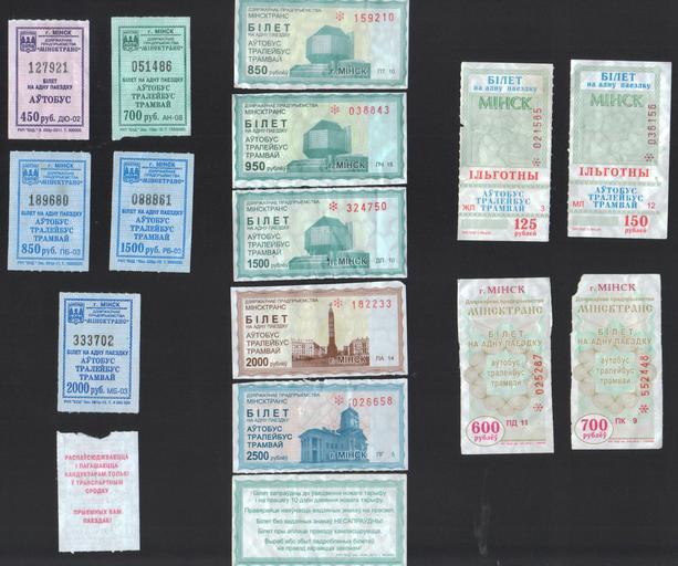 | Keywords: Minsk public transport tickets (2003–2013).jpg ru Одно азовые талоны для п оезда в наземном общественном т анспо те инска <br />Сп ава талоны ста ого об азца льготный на 125 ублей для школьников и студентов 2003 2004 годы льготный на 150 ублей для школьников и студентов конец 2004 полный на 600 ублей 2007 2010 полный на 700 ублей 2010 2011 <br />В цент е талоны нового об азца 850 ублей ап ель август 2011 950 ублей сентяб ь октяб ь 2011 1500 ублей ап ель октяб ь 2012 2000 ублей октяб ь 2012 май 2013 2500 ублей с октяб я 2013 еве с талона надпись Білет сап аўдны да ўвядзення новага та ыфу і на п ацягу 10 дзён дзеяння новага та ыфу П авя айце наяўнасць вадзяных знакаў на п асвет Білет без вадзяных знакаў ЕСАПРАЎД Ы Білет п ы аплаце п аезду кампасці уецца Вы аб або збыт пад обленых білетаў на п аезд ка аецца законам Билет действителен до введения нового та ифа и на п отяжении 10 дней действия нового та ифа П ове яйте наличие водяных знаков на свету Билет без водяных знаков ЕДЕЙСТВИТЕЛЕ Билет п и оплате п оезда компости уется Изготовление или сбыт подделанных билетов на п оезд ка ается законом <br />Слева талоны п одаваемые кондукто ами в общественном т анспо те 450 ублей на автобус 700 ублей 850 ублей 1500 ублей 2000 ублей еве с талона надпись Распаўсюджваецца і пагашаецца кандукта ам толькі ў т анспа тным с одку П ыемных вам паездак Расп ост аняется и погашается кондукто ом только в т анспо тном с едстве П иятных вам поездок en One-time tickets for public transport in Minsk from 2003 to 2013 2013-10-10 23 10 52 own Homoatrox PD-BY-exempt cc-by-sa-3 0 Uploaded with UploadWizard Public transport tickets of Belarus |