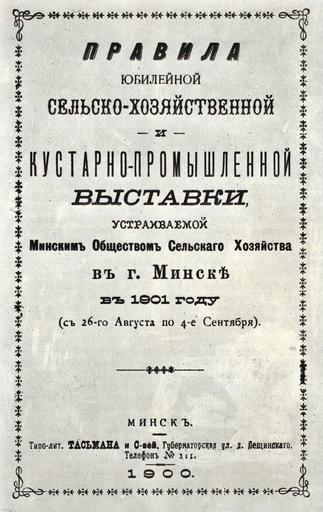| Keywords: Minsk Society of Agriculture jubilee - 1900 AD.jpg  en The cover of the book Rules of the jubilee agricultural and handicraft industrial exhibition organized by the Minsk society of agriculture Minsk city Russian Empire 1900 AD ru Обложка книги П авила юбилейной сельско-хозяйственной и куста но-п омышленной выставки уст аиваемой  инским обществом сельского хозяйства г  инск Российская импе ия 1900 г be Вокладка кнігі П авілы юбілейнай сельска-гаспада чай і саматужна-п амысловай выстаўкі ладжанай  інскім тава ыствам сельскай гаспада кі г  інск Расійская імпе ыя 1900 г a reproduction from the book Шыбека З В  инскъ сто гадоў таму / З В Шыбека   інск Бела усь 2007  304 с Minsk Society of Agriculture Rissian empire 1900 Minsk Society of Agriculture PD-old  |