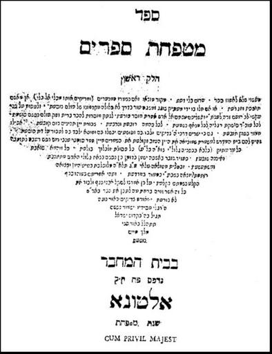 Keywords: Miṭpaḥat Sefarim.jpg he שער הספר מטפחת ספרי תקכח - 1768 http //www hebrewbooks org/21115 רבי יעקב ישרא בן צבי אשכנזי עמדין other versions PD-old-70-1923 Title pages in Hebrew