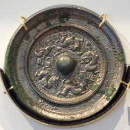 Keywords: Mirror with four (sic) auspicious animals, China, Sui or Tang dynasty, 6th century, bronze - Royal Ontario Museum - DSC04175.JPG en Exhibit in the Royal Ontario Museum Toronto Ontario Canada This work is old enough so that it is in the public domain Photography was permitted in the museum without restriction 2013-10-08 14 54 38 own Daderot cc-zero Bronze mirrors of China in the Royal Ontario Museum Uploaded with UploadWizard Bronze mirrors of the Sui Dynasty |