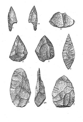 | Keywords: Miscellaneous stone tools.jpg Сл 26  К емена о уђа из  азних векова палеолитске пе иоде а из  азних земаља  1 и 1а доња и го ња ст ана ст елице са запе ком за углављивање; нађено у долини Виб ате Из исте су земље м Омб ија ст угало насликано под 2 и ошиљак под 3 Из Енглеске је мустије ски а тефакт под 4 и ста ији под 6 и 6а Овај последњи нађен је још 1799 године у Хоксну Из исте је земље и ошт ељ за џилит фо ме т ећег века али из доба познијега 7 п едставља к емено о уђе шелске фо ме из квате нога наноса у долини Делава а недалеко од Њу-Џе сеја Севе на Аме ика Project Rastko Kameno doba |
