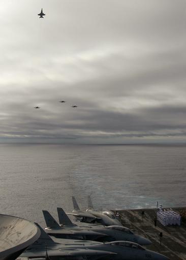 | Keywords: Missing Man Flyover formation.jpg Pilots assigned to Carrier Air Wing Three CVW-3 perform a Missing Man Flyover formation above USS Harry S Truman CVN 75 during a wreath laying ceremony held on the flight deck in memory of Capt Franklin Hooks II assigned to the Silver Eagles of Marine Fighter-Attack squadron One One Five VMFA-115 Hooks died when his F/A-18 Hornet jet crashed while conducting exercises off the aircraft carrier USS Harry S Truman near the Azores Islands on June 26 Hooks began his military career as an Electronics Technician when he joined the Navy in 1990 In 1993 he was appointed to the U S Naval Academy from which he graduated in 1997 Truman CVN 75 is participating in Majestic Eagle a multinational exercise being conducted off the coast of Morocco The exercise demonstrates the combined force capabilities and quick response times of the participating naval air undersea and surface warfare groups Countries involved in the U S -led exercise include the United Kingdom Morocco France Italy Portugal Spain and Turkey Truman's participation in Majestic Eagle is part of her scheduled deployment supporting the Navy's new fleet response plan FRP Summer Pulse 2004 the simultaneous deployment of seven carrier strike groups CSGs demonstrating the ability of the Navy to provide credible combat across the globe in five theaters with other U S allied and coalition military forces http //www navy mil/view_image asp id 16280 2004-07-18 Photographer's Mate Airman Apprentice Jay C Pugh PD-USGov-Military-Navy PD-USGov Missing man formations Flypasts at sea Summer Pulse 2004 MEDSHARK-Majestic Eagle 2004 |