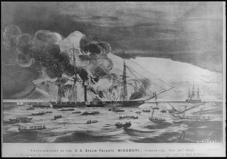 Keywords: Missouri, starboard side, burning at Gibraltar Aug. 26, 1843, 08-26-1843 - NARA - 512997.tif Local identifier 19-N-13271 Still Picture Records Section Special Media Archives Services Division NWCS-S National Archives at College Park 8601 Adelphi Road College Park MD 20740-6001 1843-08-26 Record group Record Group 19 Records of the Bureau of Ships 1940 - 1966 Record group ARC 348 Naval History Photographs Bureau of Ships compiled 1883 - 1941 Series ARC 512919 Variant control numbers NAIL Control Number NWDNS-19-N-13271<br /> Select List Identifier NAVY SHIPS 25 General notes Scope and content Missouri a 10-gun side-wheel steamer was commissioned in 1841 File unit File unit ARC yes <gallery> File Missouri _starboard_side _burning_at_Gibraltar_Aug _26 _1843 _08-26-1843_-_NARA_-_512997 tif tif File Missouri _starboard_side _burning_at_Gibraltar_Aug _26 _1843 _08-26-1843_-_NARA_-_512997 jpg jpg </gallery> NARA-cooperation PD-USGov USS Missouri ship 1841 NARA TIF images with categorized JPGs Gibraltar in the 1840s |