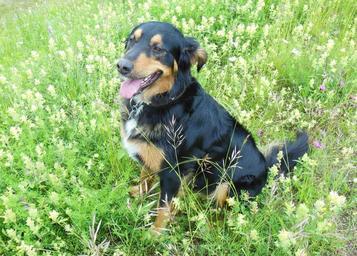 Keywords: mixed breed dog hybrid meadow dog dog on meadow flowers nature hundeportrait