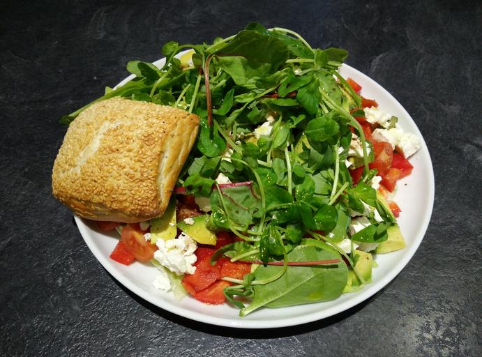 Keywords: mixed salad sesame seed bun tomato paprika feta cheese avocado healthy