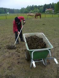Keywords: Mocka.jpg en Clearing a horse pen of dung at Almare-Stäket Sweden sv Mockning av hästhage vid Almare-Stäket Sverige own Yvwv Horse management Horse feces