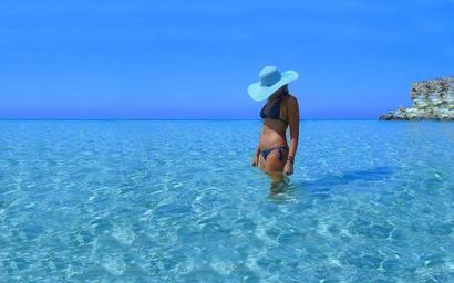 Keywords: model beauty woman female portrait water standing ocean hat tropical sexy glamour posing sea seascape shore coast fashion bikini