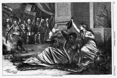 Keywords: blackandwhite monochrome photo border surreal outdoor black and white Thomas Nast's cartoon &quot;The Modern Samson,&quot; 1868. Shows the Delilah of &quot;Southern Democracy&quot; (i.e. the southern Democratic party) at right displaying the cut hair of &quot;Suffrage&quot; to the approaching Philistines at left, while a black Samson figure slowly awakes. The caricatures of armed Democratic figures include (from left to right): Wade Hampton III with a torch held high; Nathan Bedford Forrest with a Fort Pillow Medallion; Robert E. Lee squatting; presidential nominee Horatio Seymour with hair shaped into horns, wearing a Ku Klux Klan breastplate, and carrying a flag that promotes slavery, the &quot;lost cause&quot; (the Confederacy), Civil War draft riots of New York City, the Ku Klux Klan, and the Reconstruction race riots in Memphis and New Orleans; wearing another Ku Klux Klan breastplate, current vice presidential nominee Frank Blair; former Confederate Rear Admiral Raphael Semmes; and 23rd New York Governor John Hoffman with a generic Catholic Irish-American under his arm. On the far right, a statue of President Andrew Johnson is likened to a &quot;Moses&quot; of the black Americans holding a tablet labeled &quot;veto&quot; to remind the audience of his recent Reconstruction legislation veto. Under the statue is a snake with horns similar to the hair of the depiction of Seymour, alluding to Satan. Opposite, on the left, a bonfire is depicted in front of them burning the Bible as well as various symbols of knowledge including books, a scroll, and a globe. Thomas Nast's cartoon "The Modern Samson," 1868. Shows the Delilah of "Southern Democracy" (i.e. the southern Democratic party) at right displaying the cut hair of "Suffrage" to the approaching Philistines at left, while a black Samson figure slowly awakes. The caricatures of armed Democratic figures include (from left to right): Wade Hampton III with a torch held high; Nathan Bedford Forrest with a Fort Pillow Medallion; Robert E. Lee squatting; presidential nominee Horatio Seymour with hair shaped into horns, wearing a Ku Klux Klan breastplate, and carrying a flag that promotes slavery, the "lost cause" (the Confederacy), Civil War draft riots of New York City, the Ku Klux Klan, and the Reconstruction race riots in Memphis and New Orleans; wearing another Ku Klux Klan breastplate, current vice presidential nominee Frank Blair; former Confederate Rear Admiral Raphael Semmes; and 23rd New York Governor John Hoffman with a generic Catholic Irish-American under his arm. On the far right, a statue of President Andrew Johnson is likened to a "Moses" of the black Americans holding a tablet labeled "veto" to remind the audience of his recent Reconstruction legislation veto. Under the statue is a snake with horns similar to the hair of the depiction of Seymour, alluding to Satan. Opposite, on the left, a bonfire is depicted in front of them burning the Bible as well as various symbols of knowledge including books, a scroll, and a globe. ModernSamson.jpg en Thomas Nast's cartoon The Modern Samson 1868 Shows the Delilah of Southern Democracy i e the southern Democratic party at right displaying the cut hair of Suffrage to the approaching Philistines at left while a black Samson figure slowly awakes <br> The caricatures of armed Democratic figures include from left to right Wade Hampton III with a torch held high; Nathan Bedford Forrest with a Fort Pillow Medallion; Robert E Lee squatting; presidential nominee Horatio Seymour with hair shaped into horns wearing a Ku Klux Klan breastplate and carrying a flag that promotes slavery the lost cause the Confederacy Civil War draft riots of New York City the Ku Klux Klan and the Reconstruction race riots in Memphis and New Orleans; wearing another Ku Klux Klan breastplate current vice presidential nominee Frank Blair; former Confederate Rear Admiral Raphael Semmes; and 23rd New York Governor John Hoffman with a generic Catholic Irish-American under his arm On the far right a statue of President Andrew Johnson is likened to a Moses of the black Americans holding a tablet labeled veto to remind the audience of his recent Reconstruction legislation veto Under the statue is a snake with horns similar to the hair of the depiction of Seymour alluding to Satan Opposite on the left a bonfire is depicted in front of them burning the Bible as well as various symbols of knowledge including books a scroll and a globe October 3rd 1868 Issue of Harpers Weekly Page 632 Creator Thomas Nast 1868 PD-old-100 1868 cartoons 1860s political cartoons of the United States 1868 in the United States Reconstruction Era Thomas Nast Samson and Delilah Thomas Nast's cartoon "The Modern Samson," 1868. Shows the Delilah of "Southern Democracy" (i.e. the southern Democratic party) at right displaying the cut hair of "Suffrage" to the approaching Philistines at left, while a black Samson figure slowly awakes. The caricatures of armed Democratic figures include (from left to right): Wade Hampton III with a torch held high; Nathan Bedford Forrest with a Fort Pillow Medallion; Robert E. Lee squatting; presidential nominee Horatio Seymour with hair shaped into horns, wearing a Ku Klux Klan breastplate, and carrying a flag that promotes slavery, the "lost cause" (the Confederacy), Civil War draft riots of New York City, the Ku Klux Klan, and the Reconstruction race riots in Memphis and New Orleans; wearing another Ku Klux Klan breastplate, current vice presidential nominee Frank Blair; former Confederate Rear Admiral Raphael Semmes; and 23rd New York Governor John Hoffman with a generic Catholic Irish-American under his arm. On the far right, a statue of President Andrew Johnson is likened to a "Moses" of the black Americans holding a tablet labeled "veto" to remind the audience of his recent Reconstruction legislation veto. Under the statue is a snake with horns similar to the hair of the depiction of Seymour, alluding to Satan.