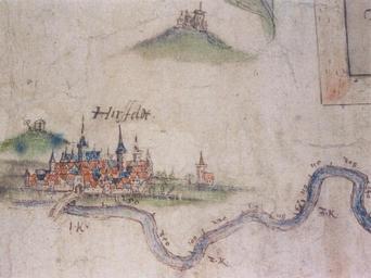 | Keywords: Moers-fuda-stromkarte1.jpg  de Erster Abschnitt aus der historischen Karte Fulda-Stromkarte von Joist Moers um 1597 angefertigt Zu sehen ist Hersfeld mit der alten Fuldabrücke und des angedeuteten Zuflusses des Geisbaches im Vordergrund Rechts daneben ist die auf freiem Feld in der Fuldaaue stehende Klauskirche eingezeichnet Links über der Stadt ist der Galgenplatz mit Galgen und dem Richtrad angedeutet lag auf einer Anhöhe des Tageberges heute vermutlich in der Straße Am Hainberg Rechts über der Stadt ist der Frauenberg mit dem dort befindlichen Koster angedeutet en First part of the historic map Fulda-Stromkarte from Joist Moers drawn around 1597 Is's shows the town Hersfeld today Bad Hersfeld the old bridge over the river Fulda the church Klauskirche outside of the defensive wall from Hersfeld the Breaking wheel and gallows the hill Frauenberg with its monastery scaned 1597 Joist Moers ca 1540 “1625 PD-old-100 PD-old-100 Joist Moers Old maps of Hersfeld Maps made in the 16th century Breaking wheels |