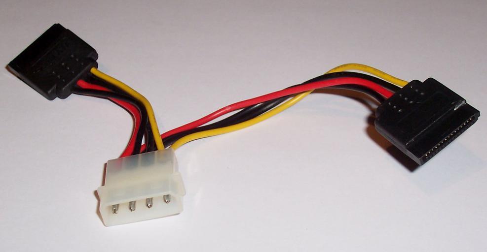 Keywords: Molex-to-SATA-power 008.jpg en Single Molex to twin SATA power connector conversion cable - version 1 own Martixer 2010-01-28 Permission is granted to use this picture for any usage by anyone This type of cable is used to supply a power connector to one or two SATA drives in a PC that has no or not sufficient native SATA power cables/connecors by connecting it to an available free/unused Molex connector Because it is a split/twin cable it can be used to supply power to two drives using only a single Molex connector Computers |