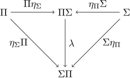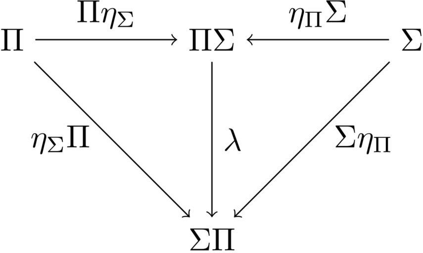 Keywords: MonadDistrEta.svg en Eta part of conditions for a distributive law for two monads <source lang latex > \documentclass10pt article \usepackage tikz \usetikzlibrary shapes arrows \begin document \pagestyle empty \begin tikzpicture scale 2 2 \node PS at 1 1 \Pi\Sigma ; \node P at 0 1 \Pi ; \node S at 2 1 \Sigma ; \node SP at 1 0 \Sigma\Pi ; \draw-> S -- nodeabove \eta_\Pi\Sigma PS ; \draw-> P -- nodeabove \Pi\eta_\Sigma PS ; \draw-> P -- nodeleft \eta_\Sigma\Pi\ SP ; \draw-> S -- noderight \ \Sigma\eta_\Pi SP ; \draw-> PS -- noderight \lambda SP ; \end tikzpicture \end document </source> 2014-01-23 20 43 35 own Daniel5Ko cc-zero Uploaded with UploadWizard Commutative diagrams