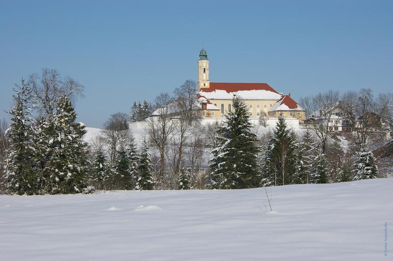 Keywords: monastery reutberg winter snow landscape wintry cold nature snow landscape snowy church baroque steeple firs sky blue sunny upper bavaria