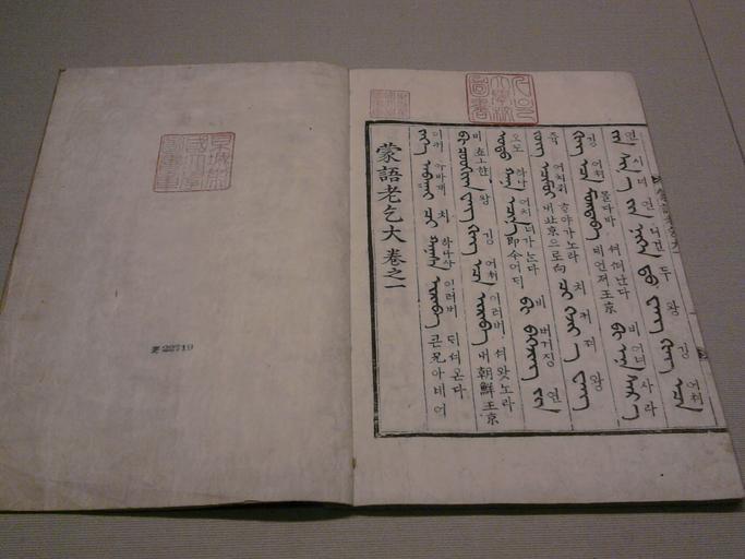 | Keywords: Mongeonogeoldae in museum.jpg Mongeonogeoldae 蒙語 乞大/몽어노걸 first roll 卷之 displayed in Seoul National University Kyujanggak Institute for Koreanology Studies Text is witten in hanja hangeul and mongol bichig mongol writting that appear at Gengis Khan time Mongeonogeoldae 蒙語 乞大/몽어노걸 premier rouleau 卷之 affiché à l'Université nationale de Séoul Institut Kyujanggak pour les études coréennes Le texte est écrit en hanja hangeul et mmongol bichig écriture mongole apparue à l'époque de Gengis Khan 蒙語 乞大/몽어노걸 语和蒙语,卷之 14世代卷 蒙語 乞大/몽어노걸 卷之 2013-08-09 11 57 39 own Salamander724 Uploaded with UploadWizard Texts in Mongolian script Korean text Books from Korea Bilingual media |