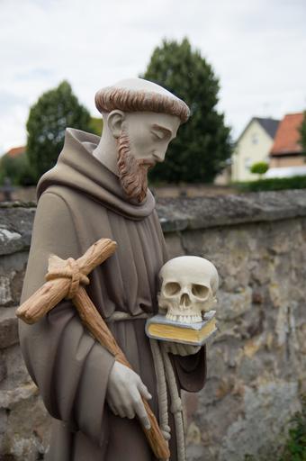 Keywords: monk christian art religious monuments statue skull cross religion cemetery book sculpture saint alsace