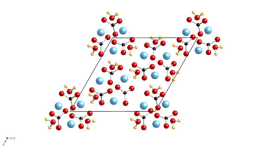 Keywords: Monohydrocalcite.jpg View of monohydrocalcite structure down 001 Own Judge Nutmeg Monohydrocalcite Carbonates