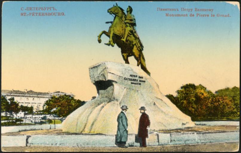 | Keywords: Monument of Peter the Great.jpg Saint Petersburg Russia Senate Square The monument to Peter the Great Санкт-Пете бу г Сенатская площадь Памятник Пет у I Saint-Pétersbourg Le Cavalier de bronze statue http //www nlr ru/petersburg/spbpcards/photos/lo000000159_1_m jpg http //www nlr ru/petersburg/spbpcards/admiralt/5 htm desc author 1900-1917 PD-Old The Bronze Horseman in historical photographs Monuments in Saint Petersburg on postcards | ||||