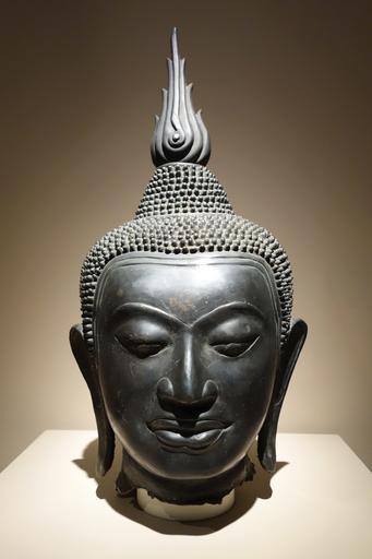 | Keywords: Monumental Head of Buddha, Thailand, second U-T'ong type, 14th-15th century AD, bronze with black patina and wood - Chazen Museum of Art - DSC01703.JPG en Exhibit in the Chazen Museum of Art University of Wisconsin-Madison Madison Wisconsin USA This artwork is old enough so that it is in the public domain Photography was permitted in the museum without restriction 2013-07-21 12 41 46 own Daderot cc-zero Sculpture of Thailand in the Chazen Museum of Art Uploaded with UploadWizard Buddhist sculptures of Thailand |