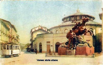 Keywords: Il monumento ai Caduti, opera di Enrico Butti (1925), collocato in piazza XX Settembre. Alle spalle del monumento il Politeama (aperto nel 1892) e a sinistra via Morosini. tram varese monumentoaicaduti piazzaxxsettembre viamorosini enricobutti