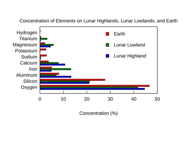 | Keywords: Moon vs earth composition.svg en Relative Concentration of Various Important Elements on Lunar Highlands Lunar Lowlands and Earth Data Source http //www permanent com/l-apollo htm own Roger wilco 2010-07-08 File Moon_VS_Earth_Composition JPG File Mond - Erde Elementanteile svg set y2label Concentration set yrange 0 50 set y2range 0 50 set ylabel 'Concentration of Elements on Lunar Highlands Lunar Lowlands and Earth' set key at graph 0 5 0 60 horizontal samplen 0 1 set label 1 'Earth' at graph 0 11 0 63 left rotate by 90 set label 2 'Lunar Lowland' at graph 0 275 0 63 left rotate by 90 set label 3 'Lunar Highland' at graph 0 44 0 63 left rotate by 90 set size ratio 2 set term svg set output 'wiki svg' plot '-' using 2/10000 xtic 1 title ' ' \ '-' using 1/10000 title ' ' \ '-' using 1/10000 title ' ' Hydrogen 1400 Titanium 4400 Magnesium 20900 Potassium 25900 Sodium 28300 Calcium 36300 Iron 50000 Aluminum 81300 Silicon 277000 Oxygen 466000 e 54 31000 57600 1100 2900 78800 132000 69700 212000 417000 e 56 3100 45500 800 3100 106800 48700 133000 210000 446000 e Moon diagrams |