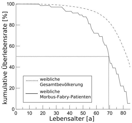 | Keywords: Morbus Fabry survival female.svg Die kumulative à berlebensrate von weiblichen Morbus-Fabry-Patienten im Vergleich zur weiblichen Gesamtbevölkerung own work data taken from K D MacDermot A Holmes A H Miners Anderson-Fabry disease clinical manifestations and impact of disease in a cohort of 60 obligate carrier females In Journal of medical genetics Band 38 Nummer 11 November 2001 pp 769 “775 1468-6244 PMID 11732485 173475 2011-09-03 Kuebi Armin Kübelbeck Cc-zero Fabry disease | ||||