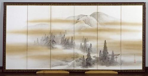 | Keywords: Mori Kansai - Kamigamo Shrine in Summer - Walters 35147.jpg The Kamigamo Shrine is the oldest Shinto shrine in the former Japanese capital of Kyoto It is dedicated to the deity Kamo-wake-ikazuchi who appeared miraculously to a daughter of the ruling clan while she was performing a purification ritual in the Kamo River The deity was initially enshrined at the top of Mount Ko seen in the distance but was transferred to this 7th-century building during the Heian period The mate to this screen also in the Walters' collection 35 148 depicts the Byodo-in a famous Buddhist temple in the nearby town of Uji between 1860 1870 Edo-Meiji ink and gold wash on paper with hints of color cm 47 136 5 accession number 35 147 35616 Dealer Osaka Toyobi Far Eastern Art Dr Frederick Baekeland and Joan D Baekeland 1987-1988 mode of acquisition unknown Walters Art Museum 1989 by purchase Museum purchase with funds provided by the W Alton Jones Foundation Acquisition Fund 1989 Signature Lower right side of righthand panel Kansai Sho O Mori Koshuka; Seal Tachibana Koshuka in Jinichi Shiyo place of origin Kyoto Japan Walters Art Museum license 2D Japanese paintings in the Walters Art Museum Mori Kansai Media contributed by the Walters Art Museum needs category review |