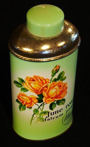 Keywords: Morny June Roses talcum powder tin, pic1.JPG Very old packaging of a Dutch product that is not produced and/or sold any more own 2014-03-14 11 05 00 Alf van Beem CC-zero Trademarked Talcum powder tins