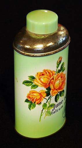 Keywords: Morny June Roses talcum powder tin, pic4.JPG Very old packaging of a Dutch product that is not produced and/or sold any more own 2014-03-14 11 06 49 Alf van Beem CC-zero Trademarked Talcum powder tins