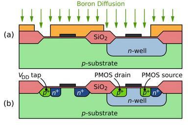 | Keywords: MOSFET Manufacture - 5 - p+ diffusion.svg Complementary metal oxide-semiconductor CMOS manufacture process A cross-section of the manufacture of a CMOS inverter <br> Stage 5 p+ diffusion own 2009-11-16 Inductiveload Own work all rights released Public domain CMOS manufacture |