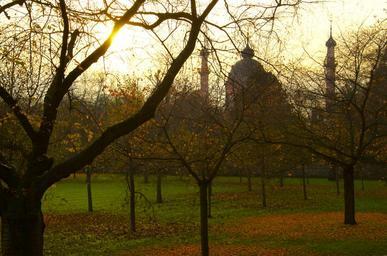Keywords: mosque schwetzingen minaret schlossgarten castle castle park romantic beautiful trees twilight germany garden melancholic evening orange sunset