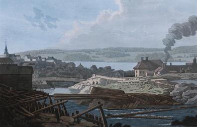 Keywords: Moss-above-bridge.jpg Artwork Creator John William Edy en Mos above the Bridge No LXVII MOS ABOVE THE BRIDGE At an elevated spot on the ruins of an old saw-mill this view of the town of Mos was taken ; where the waters of an extensive lake called Van-Soe enter it in a never-failing Moss river stream down which vast quantities of timber are continually floating from the forests in the vicinity of the lakes above to the booms about this place Immediately under the bridge a quick descent occurs forming a considerable and beautiful cascade The water by an ingenious arrangement of shutes or tanks formed of timber is conducted from wheel to wheel through thirty saw-mills the noise of which with the roaring of the cascade deafens the ear The streams for the use of the furnace and forges are carefully conducted in the wooden troughs seen on the right and are transmitted to them after turning a grist-mill and passing through an aqueduct over the high road The large house was one of the temporary residences of the late Honourable B Anker ; beyond it is seen the smoke from his extensive Moss Jernverk iron-works which occupy the whole space on that side down to the margin of the bay Over the bridge which is very compactly built of timber for carriages with heavy loads the road from Christiania joins the town of Mos It is very amazing to look down from it on the cascade and on the numerous moving objects below with the water roaring and foaming among them There is a smaller bridge for foot passengers half way down near the house of an ingenious dyer who has discovered that these waters possess the great requisite for producing and fixing the rich and brilliant scarlet colour on cloth previously unknown in Norway The specimens are equal to any in Europe The principal street commencing at the bridge is inhabited chiefly by shopkeepers ; other streets branch off to the church and toward the side of the bay Mos though not a large town contains many good houses particularly in the two quarters above-mentioned The situation vies with any in Norway; the soil is productive ; the views in every point are interesting and pleasing ; the roads are good and of gentle ascent; provisions are abundant and reasonable ; and the inhabitants are frank and hospitable The church is a large brick structure with a lofty tower and spire ; it is handsomely decorated within having a grand altar between two massy pillars The devotional ceremonies of the Lutheran religion are performed here on Sundays in a solemn and impressive manner to a very numerous congregation collected from miles around Some of the natural beauties of the large peninsula of Ielon are seen over the bay presenting the luxuriant appearance of the most studied park scenery in ornamental villas woods groves lawns and cultivated grounds as far as the eye can reach The sandy isthmus which forms the access to it by land is immediately beyond the houses near the church ; it is elevated only a few feet above the level of the water and is so narrow that during certain strongwinds the road over it is rendered almost impassable being entirely overflowed by the surf of the sea below or from the bay above Collapse bottom http //urn nb no/URN NBN no-nb_digibok_2011072910001 Boydell's picturesque scenery of Norway London 1820 Plate no 67 p 341 in scanned copy 59 439444 10 669440 20 Location estimated no-nb_digibok_2011072910001 PD-Art-100 John William Edy Moss Jernverk Moss Norway in art Timber floating in Norway Boydell's picturesque scenery of Norway Lakes of Østfold |