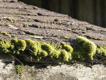 Keywords: moss covered roof asphalt shingles noture humid shed close-up old building wooden