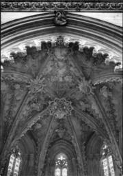 Keywords: arquitectura gótico portugal batalha mosteiro santa vitória fundação calouste gulbenkian fundaçãocaloustegulbenkian maria pia mariapia architecture church gothic monastary mário tavares chicó máriotavareschicó mário novais márionovais gótica biblioteca de arte bibliotecadearte Abóbada da capela de D. João II. Fotógrafo: Mário Novais, 1899-1967. Orientador científico: Mário Tavares Chicó, 1905-1966. Data aproximada da produção da fotografia original: 1954. O Mosteiro da Batalha é o mais importante símbolo da Dinastia de Avis. Ele foi construído por iniciativa de D. João I, na sequência de um voto à Virgem, caso vencesse a Batalha de Aljubarrota (1385). Ao longo do século XV, praticamente todos os monarcas aqui deixaram a sua marca. O arranque das obras deu-se em 1388 e foi conduzido por Afonso Domingues, que se manteve à frente do estaleiro até 1402, ano em que faleceu. A ele se atribui o plano geral da construção e o grande avanço dos trabalhos na igreja e no claustro. Não terá tido tempo de executar a fachada principal nem o abobadamento do templo, deixando igualmente inacabado o claustro. A magnífica igreja de três naves e transepto saliente por si delineada, com cabeceira de cinco capelas, sendo a central de duplo tramo e terminação poligonal, terá sido o ponto alto da sua carreira, mas revela bem o nível ainda algo arcaizante da arquitectura portuguesa de finais do século XIV, alheia aos progressos do Gótico Flamejante, que tanto iria marcar a segunda fase do monumento. Com efeito, a partir de 1402, a chefia do estaleiro foi entregue a Huguet, arquitecto de provável origem catalã que inaugurou, entre nós, o tardo-gótico. Documentado à frente do projecto até 1438, a ele se deve o abobadamento dos espaços da igreja e da Sala do Capítulo (onde experimentou, pela primeira vez, uma abóbada estrelada), a construção da Capela do Fundador e, ainda, o início das obras das Capelas Imperfeitas, bem como a conclusão da fachada principal, onde sobressai o portal axial. Este, é delimitado por um arco canopial que integra os escudos de D. João I e de D. Filipa. No tímpano, exibe-se Cristo em Majestade ladeado pelos Evangelistas e as arquivoltas são repletas de figurações que continuam pelas estátuas-colunas, ao abrigo de um complexo programa iconográfico. Mas a mais emblemática obra de Huguet é a Capela do Fundador. Ela foi concebida para panteão régio e sabemos que já se encontrava em obras em 1426. É um compartimento quadrangular que se adossa aos três tramos ocidentais da fachada lateral Sul e integra, ao centro, um esquema octogonal de suportes onde descarrega a abóbada estrelada, solução primeiro experimentada em Inglaterra, mas rapidamente difundida pela Europa. No circuito interior desta capela, colocou-se o túmulo duplo de D. João I e de D. Filipa, realização igualmente sem antecedentes no nosso país e que resulta de uma nítida influência da tumulária inglesa. Na capela repousam também os filhos do casal régio (como D. Henrique e o regente D. Pedro), de acordo com a decisão testamentária de D. João I em fazer deste espaço um efectivo panteão. Em 1436, D. Duarte decidiu edificar uma capela funerária para si próprio. O projecto então concebido por Huguet foi o mais arrojado da sua carreira na Batalha, privilegiando uma planta circular que, todavia, não viria a ser concluída pelo falecimento do mestre dois anos depois. Desta forma, e não obstante a intervenção de Mestre Martim Vasques, a construção cessou até ao reinado de D. Manuel e, mesmo nessa altura, não foi concluída, razão de esta parcela ser conhecida como as Capelas Imperfeitas. No reinado de D. Afonso V, edificou-se o segundo claustro do mosteiro. Ele resulta da intervenção do arquitecto Fernão de Évora e, estilisticamente, é uma obra que contraria o tardo-gótico de raiz flamejante, tendo-se optado deliberadamente pela austeridade arquitectónica, que rejeita até a inclusão de capitéis a marcar o arranque dos arcos. A Batalha teve outras fases construtivas igualmente relevantes, como o Manuelino ou o Renascimento. Todavia, a mudança dinástica verificada com D. Manuel privilegiou outros locais e, só no século XIX, o Mosteiro voltou a ser intervencionado, desta vez com o objectivo de restaurar o conjunto, campanha que se prolongou por meio século. (Fonte: IPPAR - tinyurl.com/5dmlfe) [CFT015.169.ic] Abóbada da capela de D. João II. Fotógrafo: Mário Novais, 1899-1967. Orientador científico: Mário Tavares Chicó, 1905-1966. Data aproximada da produção da fotografia original: 1954. O Mosteiro da Batalha é o mais importante símbolo da Dinastia de Avis. Ele foi construído por iniciativa de D. João I, na sequência de um voto à Virgem, caso vencesse a Batalha de Aljubarrota (1385). Ao longo do século XV, praticamente todos os monarcas aqui deixaram a sua marca. O arranque das obras deu-se em 1388 e foi conduzido por Afonso Domingues, que se manteve à frente do estaleiro até 1402, ano em que faleceu. A ele se atribui o plano geral da construção e o grande avanço dos trabalhos na igreja e no claustro. Não terá tido tempo de executar a fachada principal nem o abobadamento do templo, deixando igualmente inacabado o claustro. A magnífica igreja de três naves e transepto saliente por si delineada, com cabeceira de cinco capelas, sendo a central de duplo tramo e terminação poligonal, terá sido o ponto alto da sua carreira, mas revela bem o nível ainda algo arcaizante da arquitectura portuguesa de finais do século XIV, alheia aos progressos do Gótico Flamejante, que tanto iria marcar a segunda fase do monumento. Com efeito, a partir de 1402, a chefia do estaleiro foi entregue a Huguet, arquitecto de provável origem catalã que inaugurou, entre nós, o tardo-gótico. Documentado à frente do projecto até 1438, a ele se deve o abobadamento dos espaços da igreja e da Sala do Capítulo (onde exper