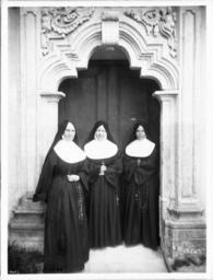 | Keywords: Mother Louis, Sister Superior, and two nuns at Mission San Carlos, Monterey, ca.1903 (CHS-4093).jpg  en <br> Mother Louis Sister Superior and two nuns at Mission San Carlos Monterey ca 1903 Photograph of Mother Louis Sister Superior and two nuns at Mission San Carlos Monterey ca 1899 They are all wearing habits Mother Louis has round spectacles left Her left hand fingers a cross hanging on a cord around her neck The two other sisters hold their hands clasped in front of them and also have crosses hanging around their necks They all stand in a stone carved entryway the side entrance outside Call number CHS-4093 Photographer James George Wharton Filename CHS-4093 Coverage date circa 1899 Part of collection California Historical Society Collection 1860-1960 Format glass plate negatives Type images Geographic subject city or populated place Carmel Repository name USC Libraries Special Collections Accession number 4093 Microfiche number 1-126-8 Archival file chs_Volume96/CHS-4093 tiff Part of subcollection Title Insurance and Trust and C C Pierce Photography Collection 1860-1960 Repository address Doheny Memorial Library Los Angeles CA 90089-0189 Geographic subject country USA Format aacr2 1 photograph glass photonegative b w ; 22 x 17 cm Rights Digitally reproduced by the USC Digital Library; From the California Historical Society Collection at the University of Southern California Subject adlf religious facilities Repository email specol usc edu Contributing entity California Historical Society Date created circa 1899 Publisher of the digital version University of Southern California Libraries Format aat photographs Geographic subject state California Legacy record ID chs-m16599 Access conditions Send requests to address or e-mail given Phone 213 821-2366; fax 213 740-2343 Geographic subject county Monterey Subject lcsh Missions Spanish; Nuns Subject Carmel Mission; Missions -- Mission Carmel San Carlos Borromeo de Carmelo ; Mission San Carlos; Mission San Carlos Monterey circa 1899 date created James George Wharton http //digitallibrary usc edu/cdm/ref/collection/p15799coll65/id/16528 PD-old-70-1923 Images from USC Digital Library uploaded by Fæ California Historical Society Collection 1860-1960 Glass plate negatives Photographs by George Wharton James Mission San Carlos Borromeo de Carmelo |