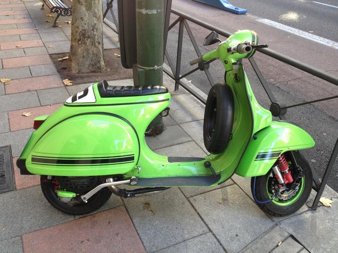 Keywords: moto scooter green old restored motorcycle street sidewalk