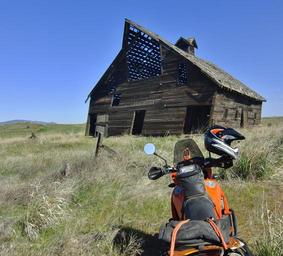 Keywords: motorcycle ktm 990 barn country outside farm abandoned blue sky grass orange